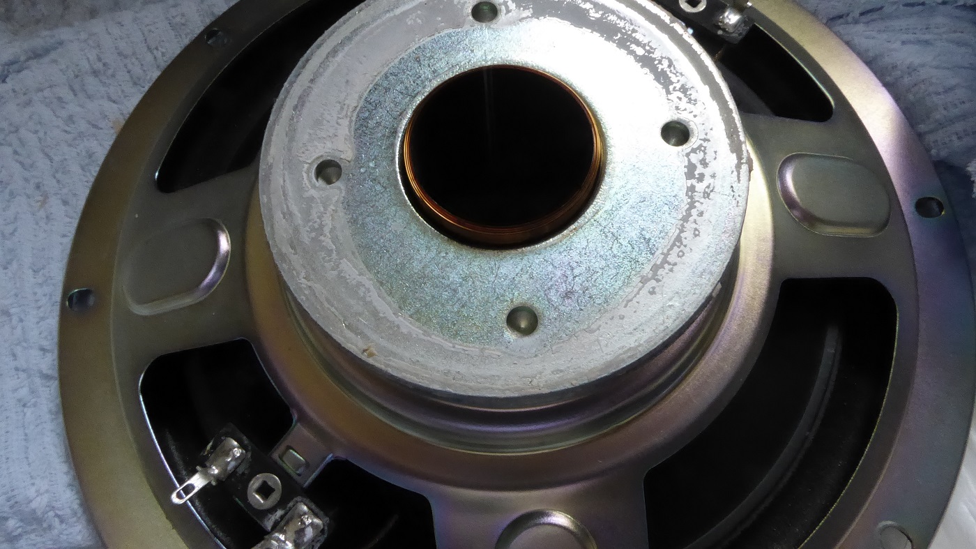 ボイスコイルはスムーズに動いたので大丈夫なようだったので又磁石を取り付けたがコーン紙は全く動かず。それで磁石を少し回転させるとカチッという手ごたえがあってコーン紙がスムーズに動くようになった。