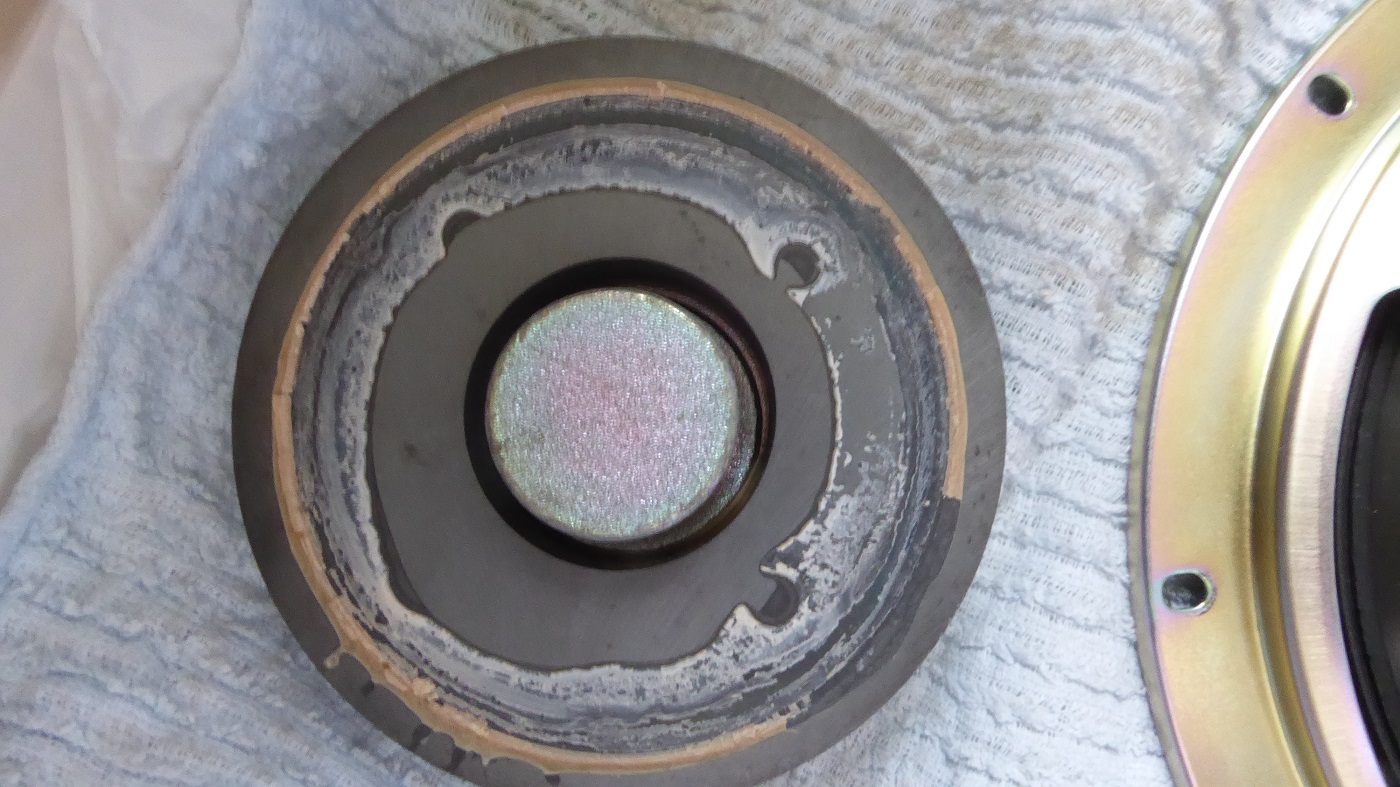 部屋に持ってきて分解してセンターキャップをカッターで切ろうとしたが硬すぎて傷すらつかなかった。あきらめて中にゴミがたまっていたら叩いて取れないかなと思いフレームを手で叩いていたら、なんか変な感じがしたので磁石をグリグリ動かしたら少し動いたので、引っ張って取ろうとしたら斜めに少し動くがすぐ磁力の力で戻ってしまう。すごい力だ。