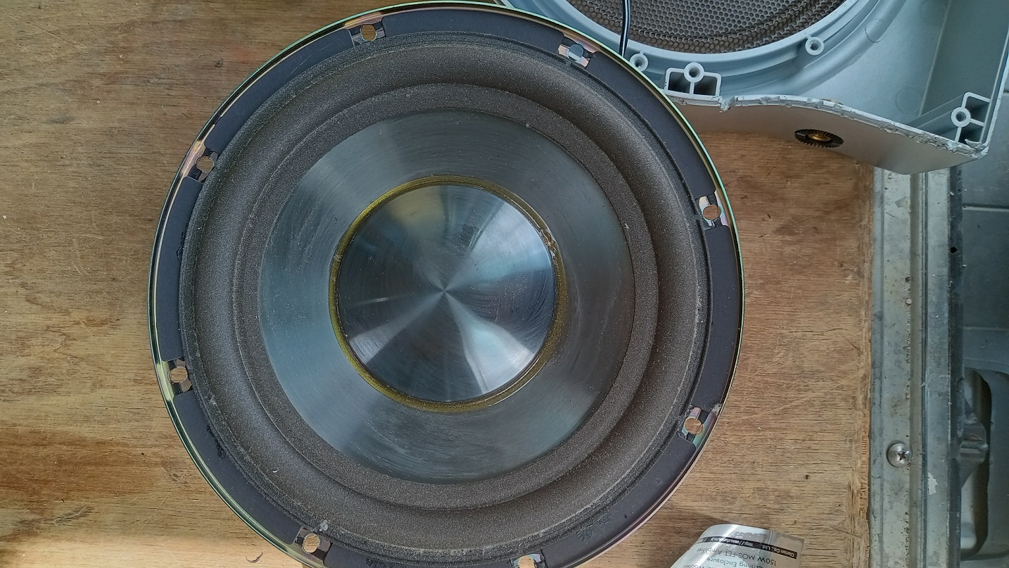 クラリオンのサブウーファーSRV212の掃除をしようとして分解しようとしたが隠れているネジのことを忘れていて無理やり開けようとマイナスドライバーでこじったりゴムハンマーで叩いたりしたおかげで音が出なくなった。