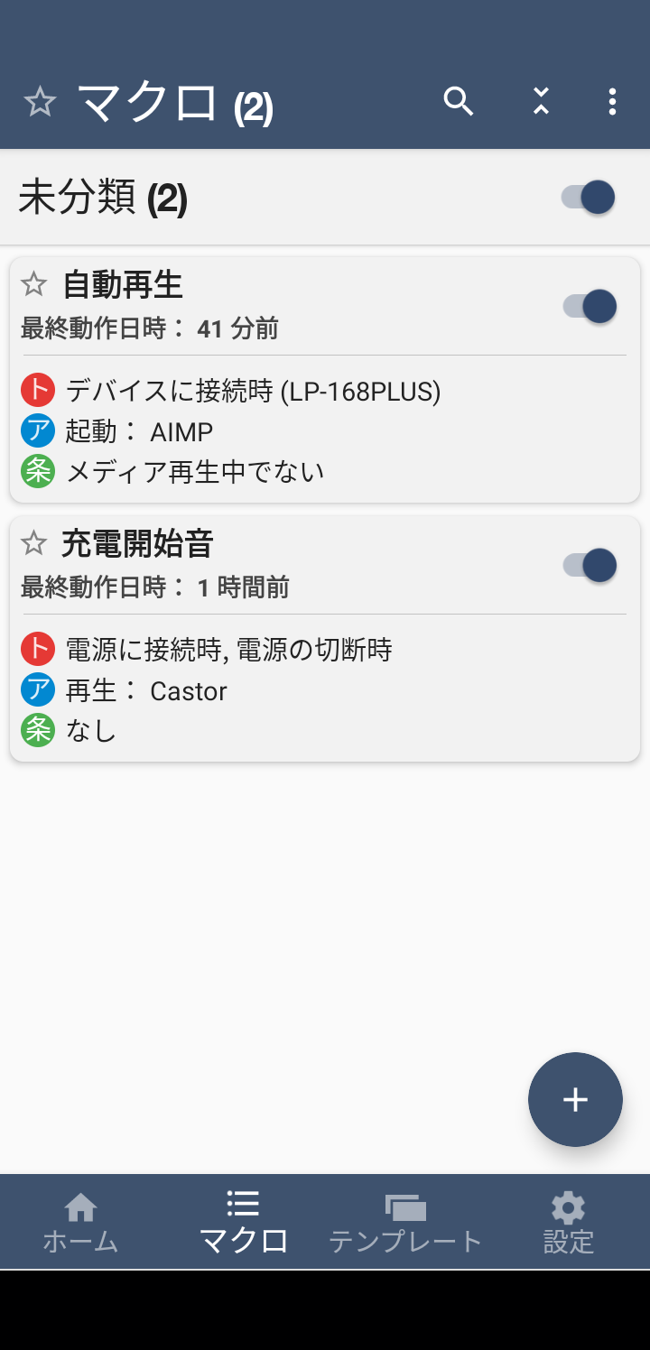 そこでスマホに今入れている無料の音楽再生アプリAIMPをMacroDroidというアプリで同じようにできないか試してみた。