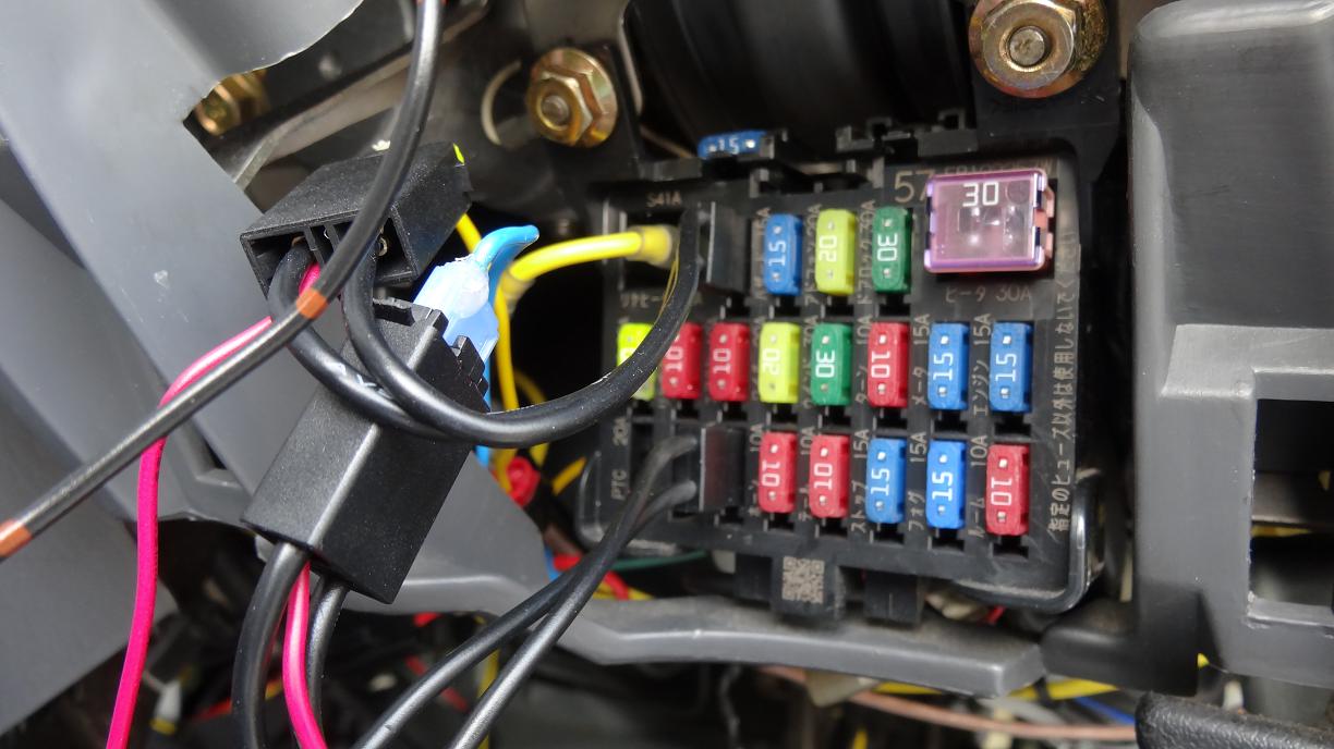 メインハーネスはアースとACCと常時電源の3本なのでACC以外はキーレスエントリーのアースと常時電源から分岐。ACCはヒューズボックスから分岐。そしてアンテナ線を配線して完了。
