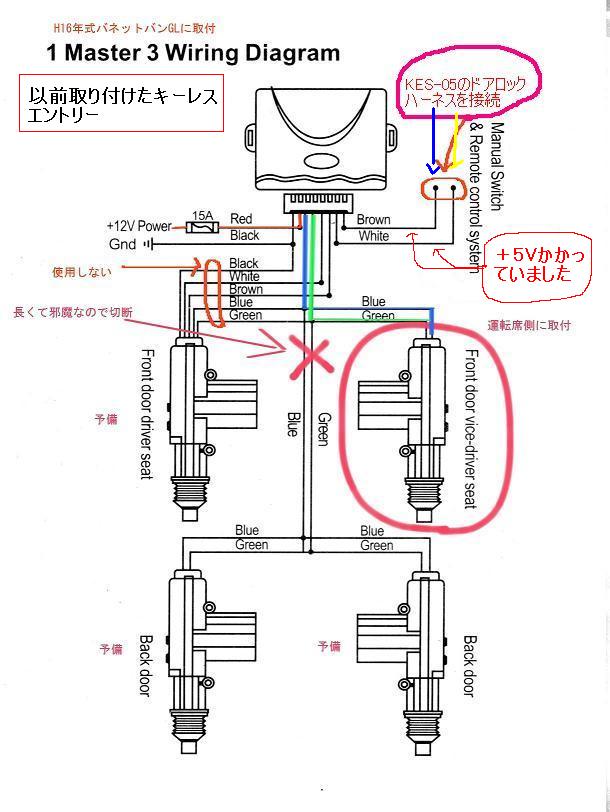 配線は、以前取り付けたキーレスエントリーの本体から出ている茶色の線と白の線にKES-05のドアロックハーネスを接続。