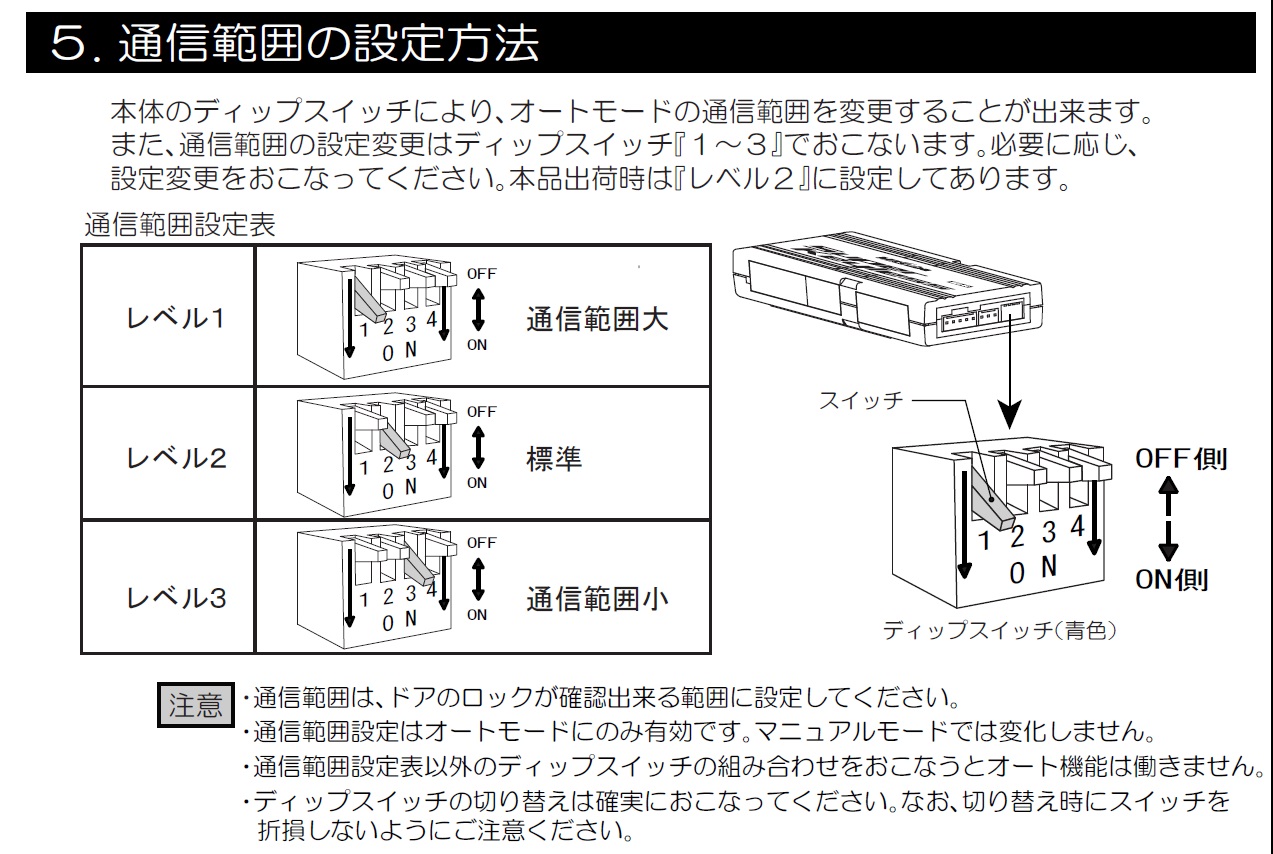 動作確認で受信感度の調整を本体のデップスイッチで高感度、標準、低感度のどれかに設定する。