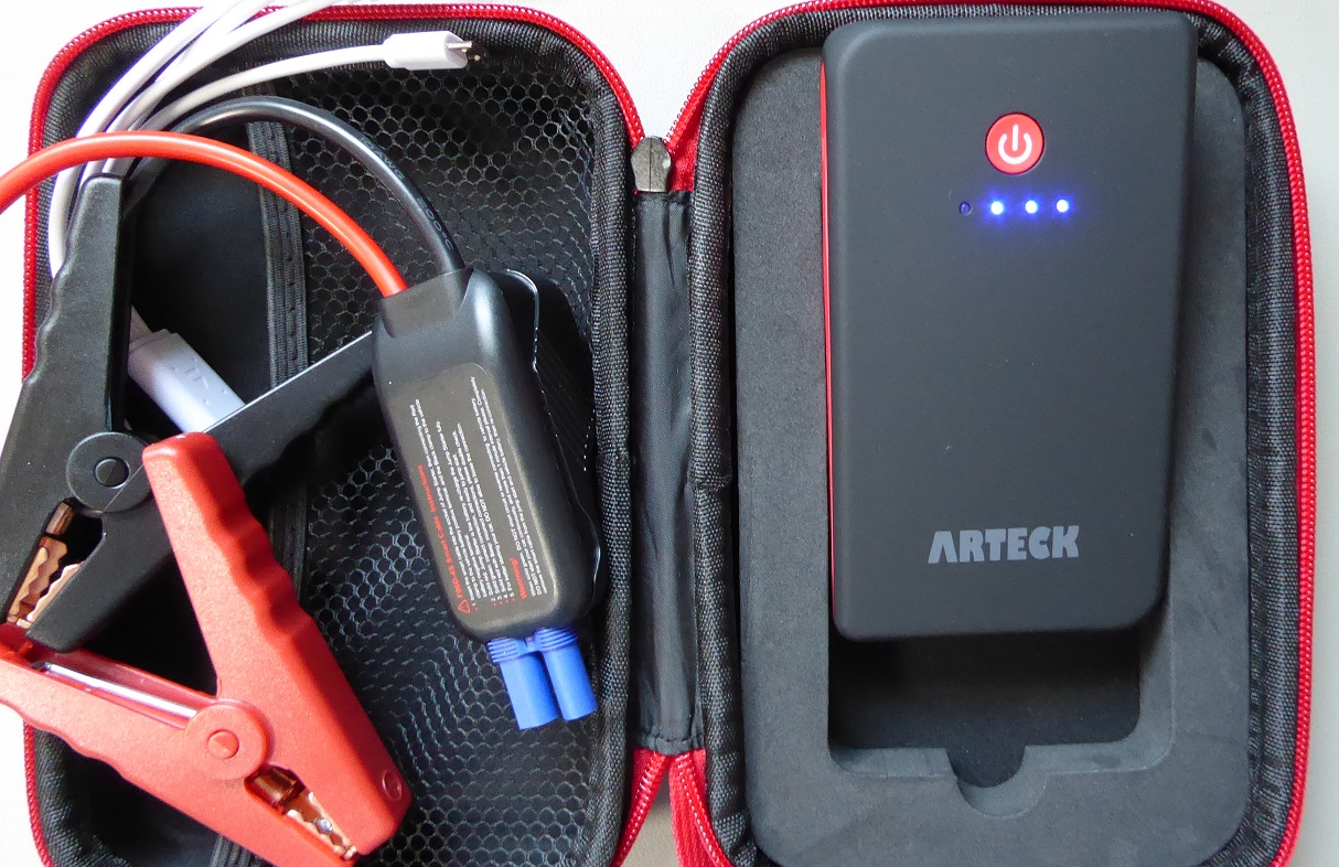 車に保管していたジャンプスターターを部屋に持ってきて電源を入れてみた。LEDは4個点灯した。