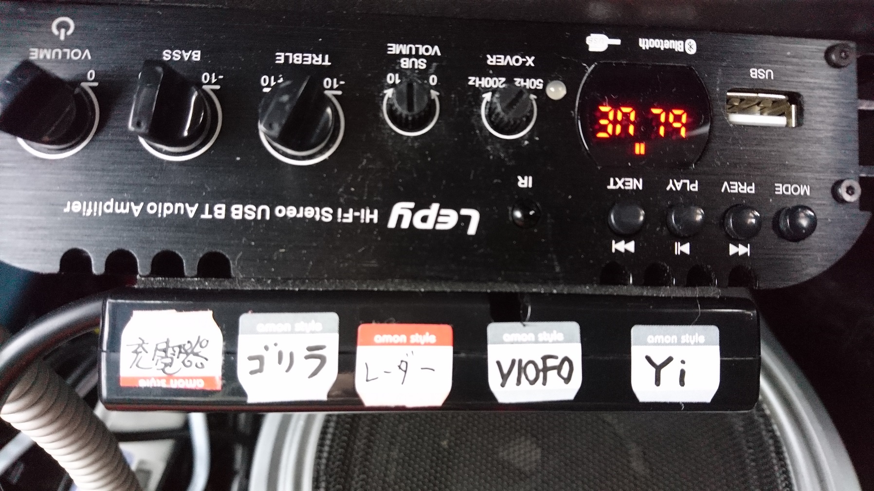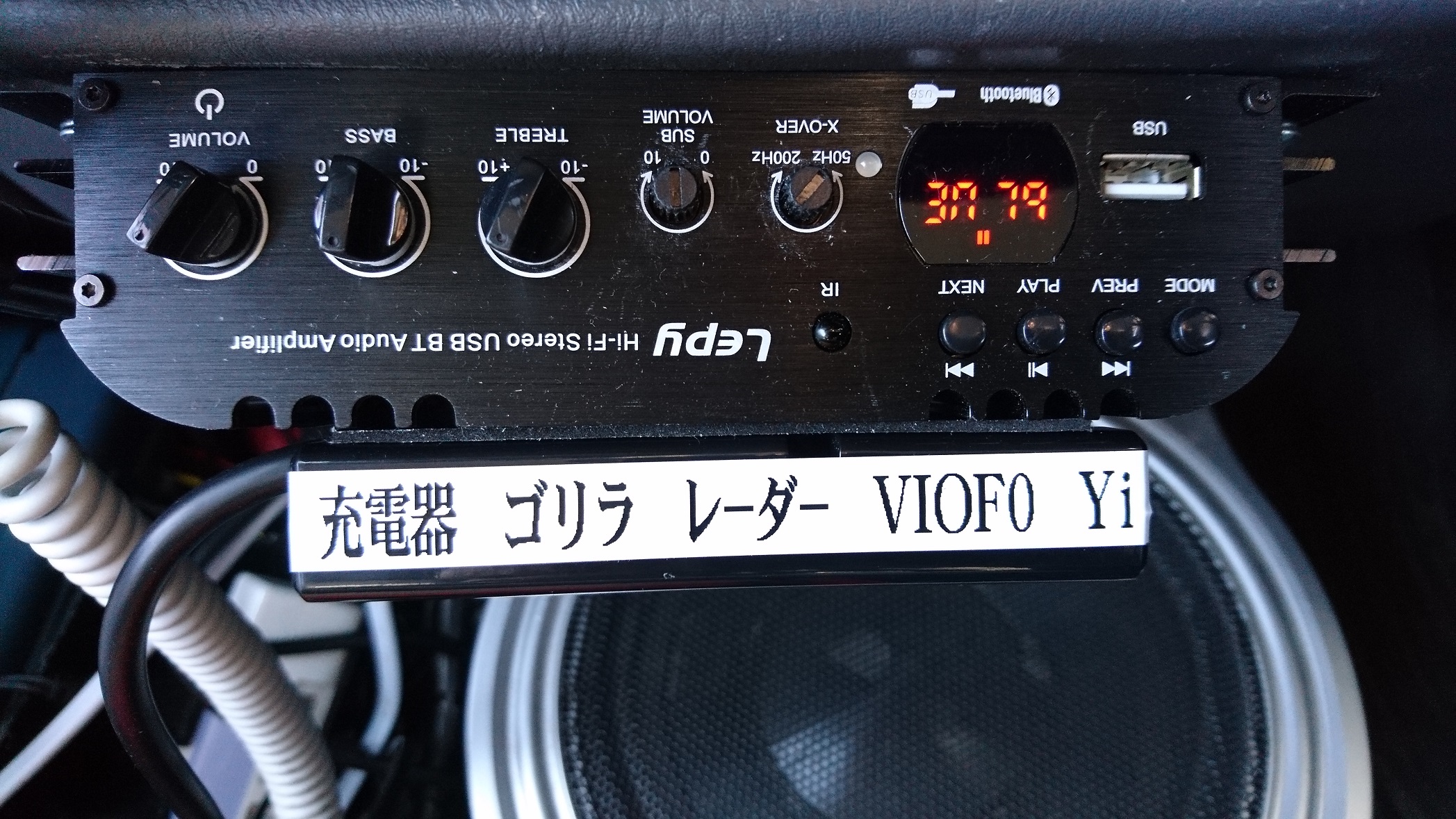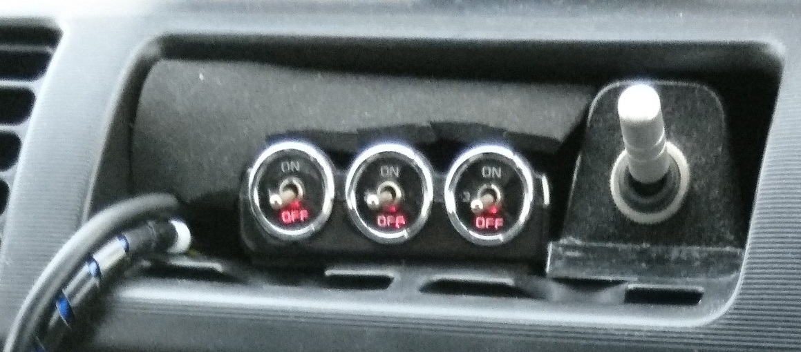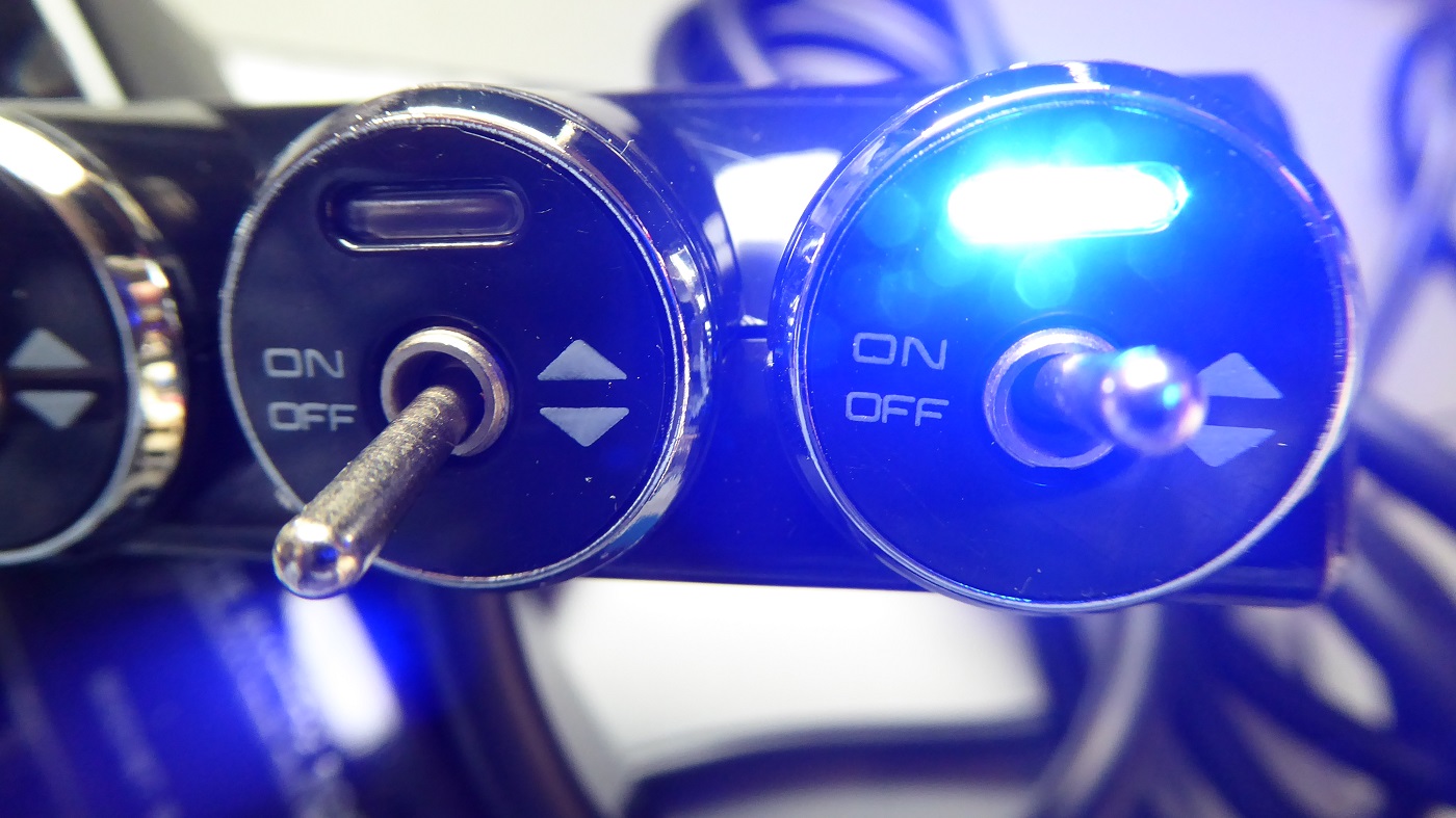 5連ソケットにはドラレコ2台とカーナビのゴリラとレーダー探知機とスマホ用の12V充電アダプタを差し込んだ。スイッチの取り付け場所は、明るすぎる青色LEDが直接視界に入らないよう後付アンプの下にスイッチを床に向けて取り付けた。