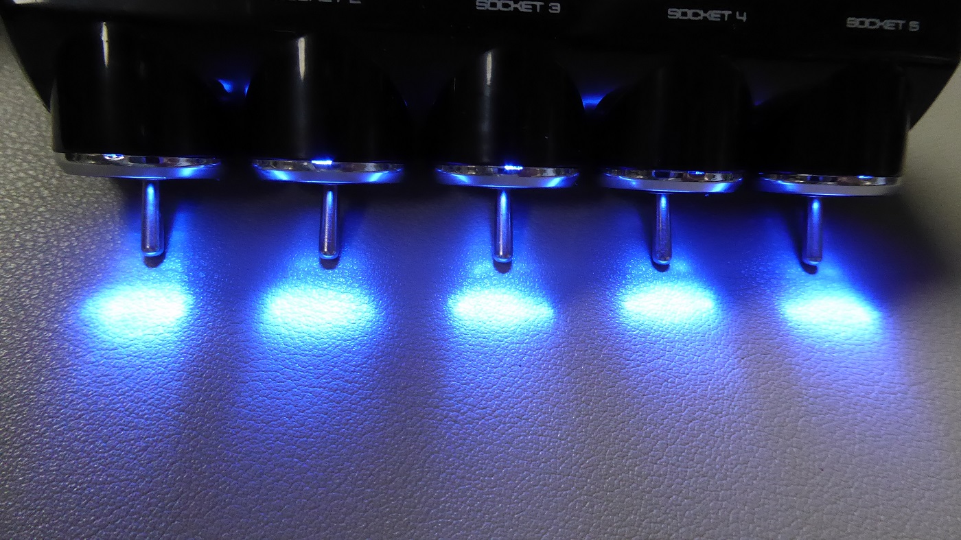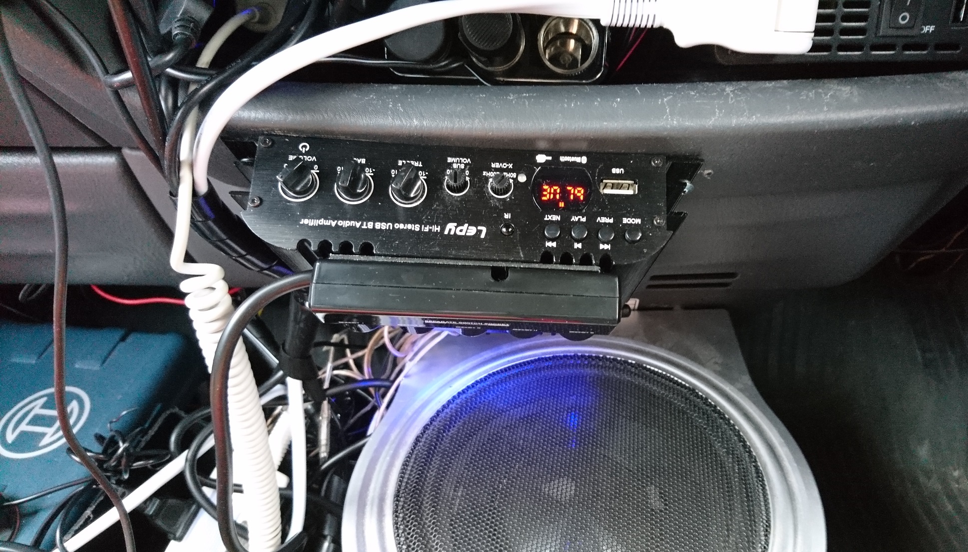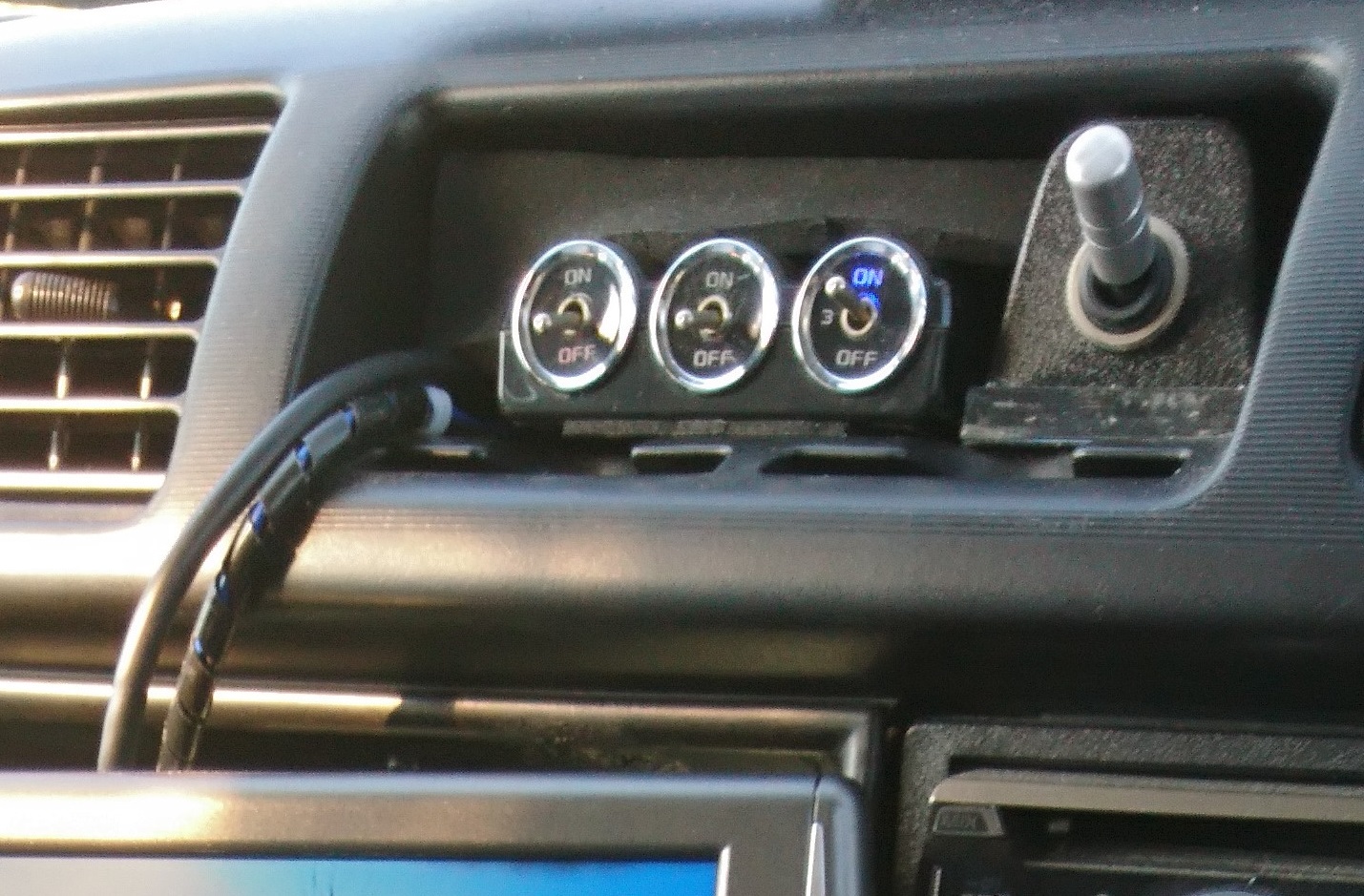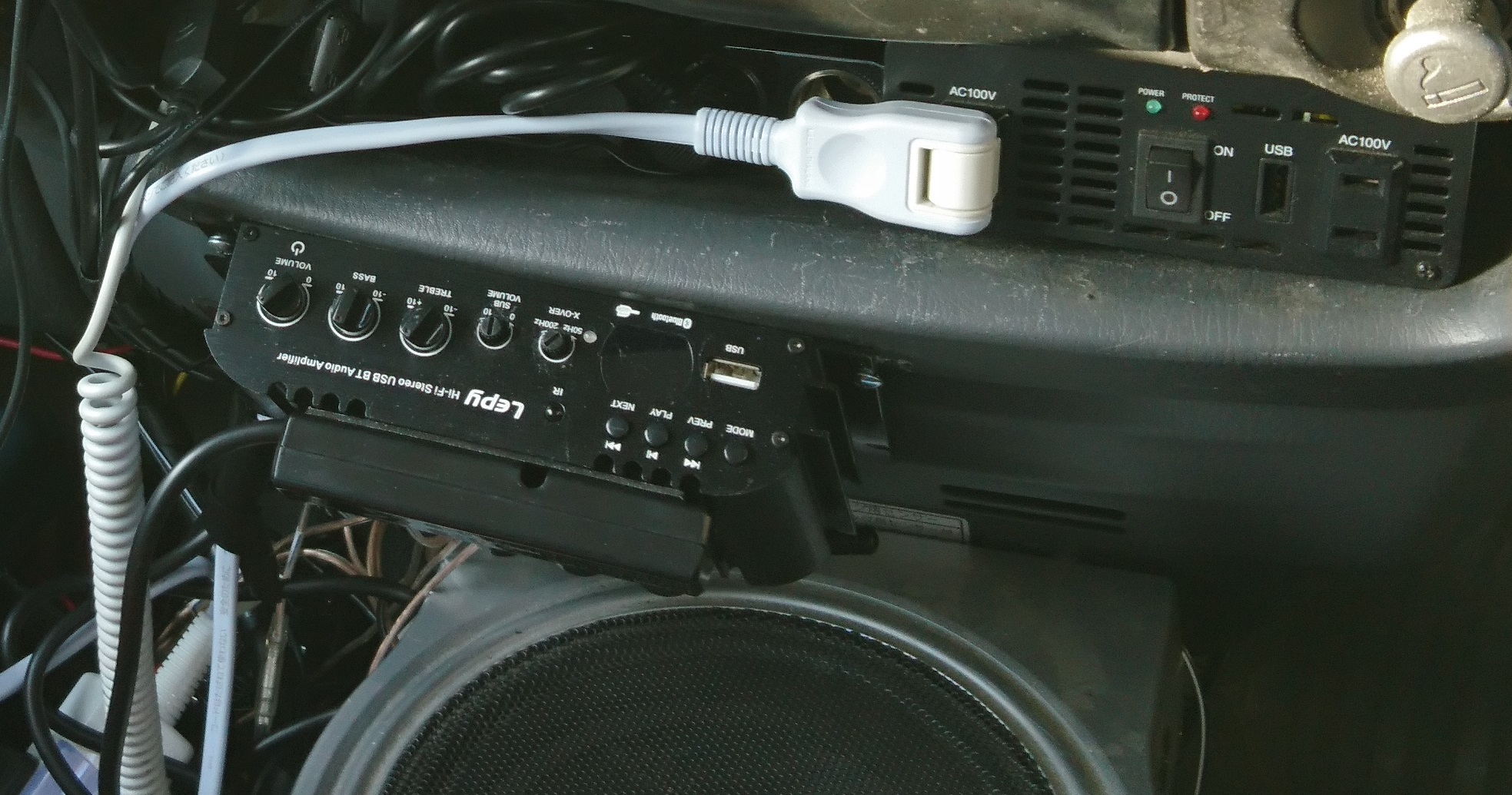 5連ソケットにはドラレコ2台とカーナビのゴリラとレーダー探知機とスマホ用の12V充電アダプタを差し込んだ。スイッチの取り付け場所は、明るすぎる青色LEDが直接視界に入らないよう後付アンプの下にスイッチを床に向けて取り付けた。