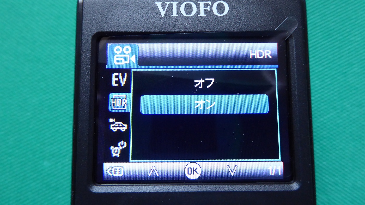 HDRはONのほうがいい。OFFにすると白飛びしやすい。Yiのドラレコに比べると白飛びの度合いがすごい。