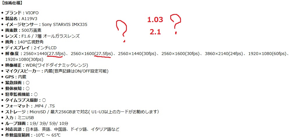今amazonのページを見たら解像度:2560×1440(27.5fps)、2560×1600(27.5fps)、2560×1440(30fps)、2560×1600(30fps)、3860×2140(24fps)、1920×1080(60fps)、1920×1080(30fps)とあったがそんなもんどこにもないぞ。ファームウエア2.1にしたらいけなかったのか。最初の1.03に戻したくても最新版のファームウエアだけしかなくて以前のバージョンは見当たらない。どうしたらいいのかわからん。あーわからん・・・