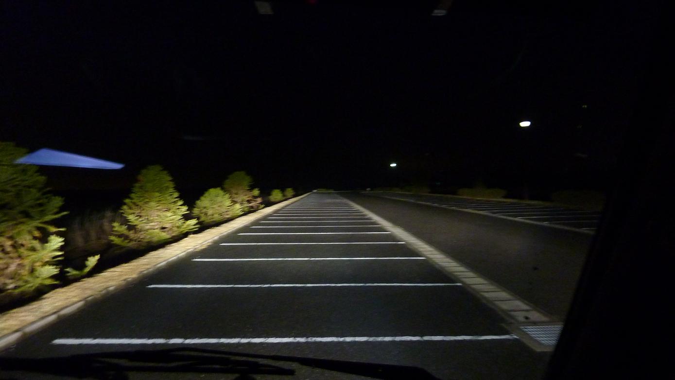暗くなって点灯テスト。めちゃ明るい。真っ白。カットラインもハロゲンバルブの時と全く同じ。調整しなくてすんだ。ちなみにこの車のライトは、レンズカットタイプだ。
