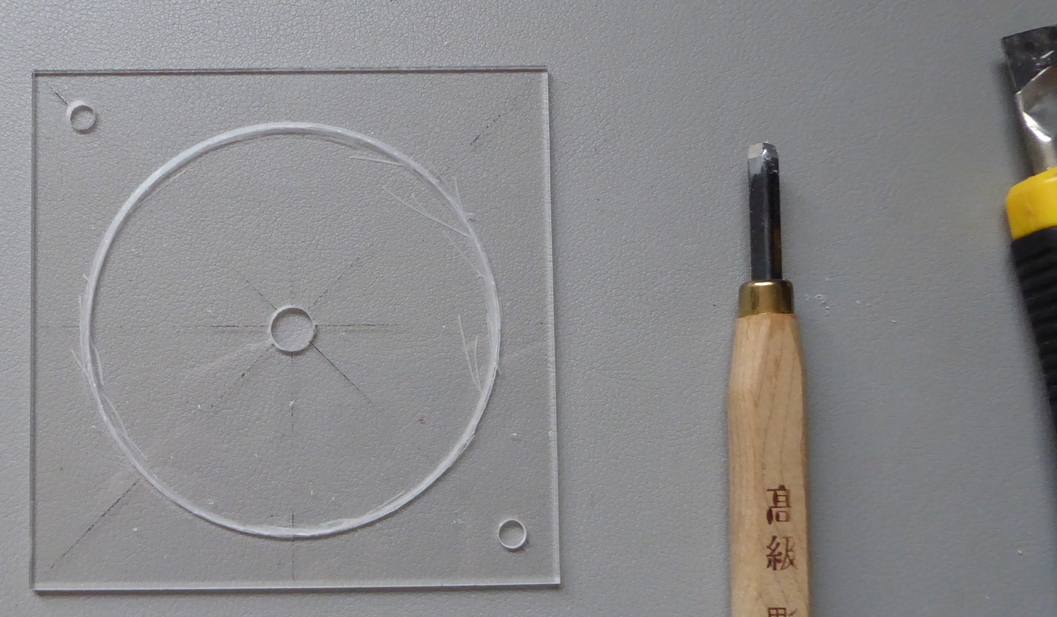 カッターの刃の裏で削ってみたり彫刻刀で削ってみたりした。