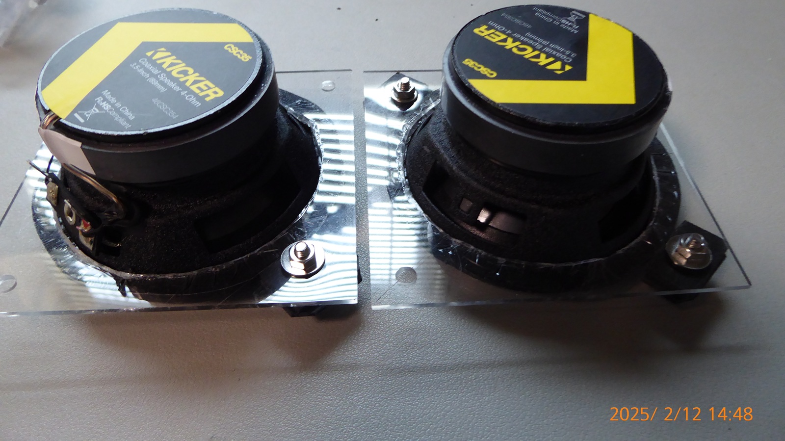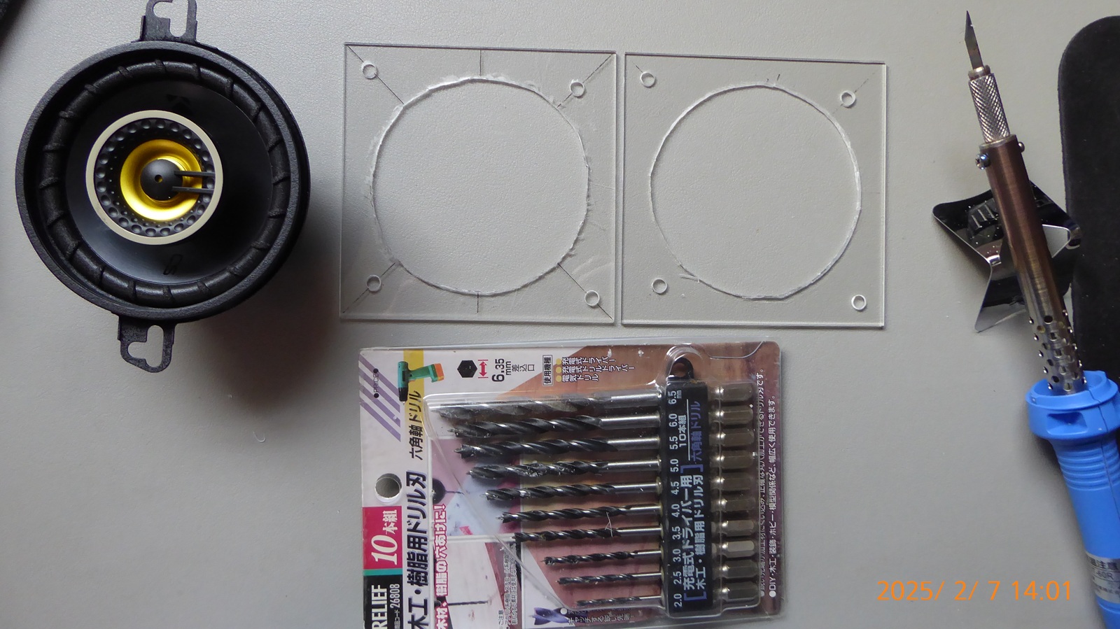 フロント10センチスピーカーをこの間ヤフーショップで購入したKicker CSシリーズ 8.9cm(3.5")コアキシャルスピーカー CSC354(46CSC354)に交換するために10cm真四角のアクリル板2ミリ厚¥2982枚に穴をあけるためにああだこうだやって何とか開けた。自在錐という穴あけ工具¥1299も購入した。