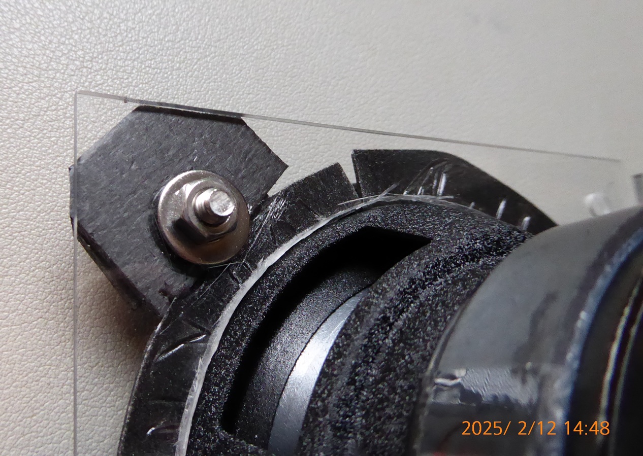 ネジとナットの隙間にはmonotaroで¥945で購入したアクリルサンデーのPPクラフトシート黒色 厚さ0.75mm幅490mm長さ565mmの余りを小さく切って二枚重ねて挟んだ。