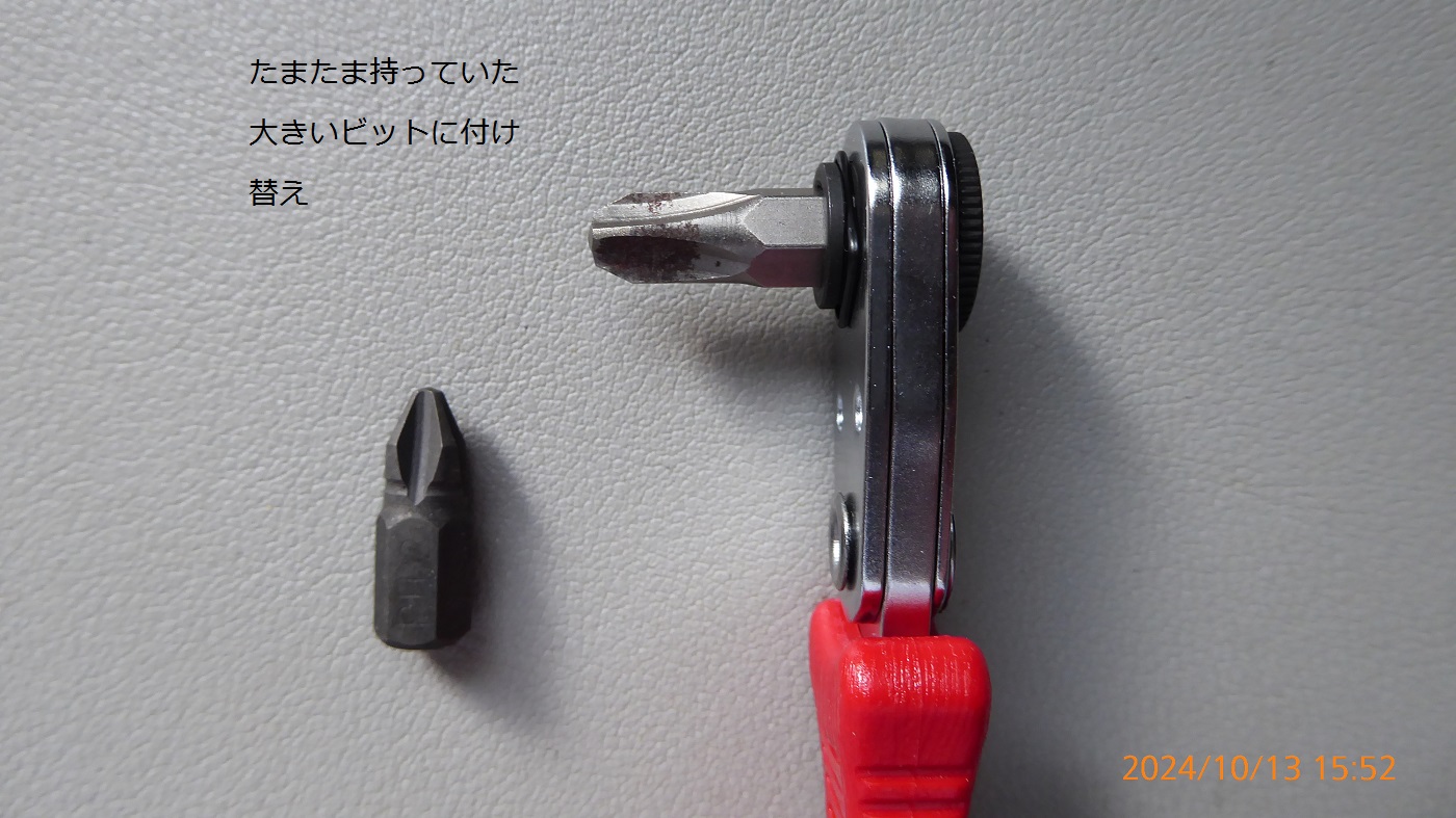 自分でやってみたがプラスネジの大きさが大きくてきれいに合わなかったし結構固く締まっている。アマゾンからラチェットドライバー¥880を購入。たまたま電ドラ用の大きいビットを持っていたのでこれでいけるかなあ。明日やってみよう。