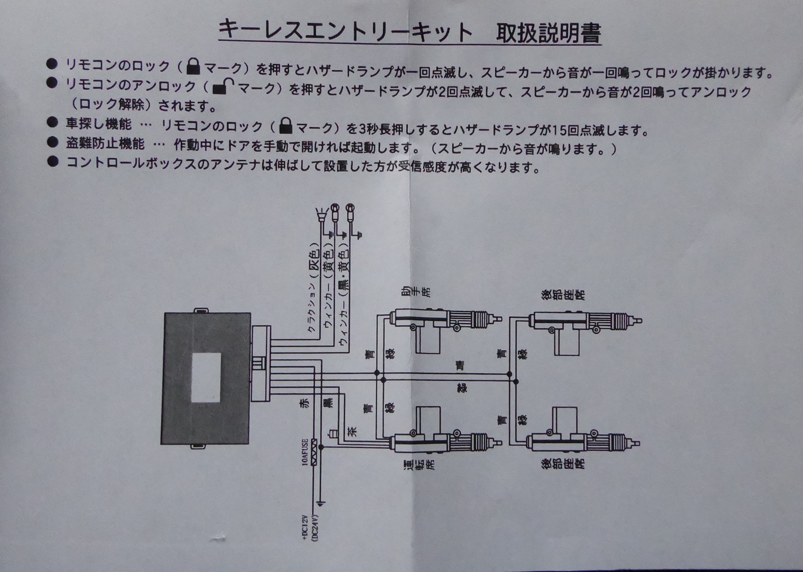 2011年に楽天から購入して取り付けていた激安キーレスエントリーのリモコンが行方不明になったので2023年にYahooから3750円で購入していたキーレスエントリーキット 汎用 4ドア アンサーバック機能 自動車 リモコン 集中ドアロック 後付け 12V カー用品 N◇ キーレスエントリーフルキットの本体のみ交換した。