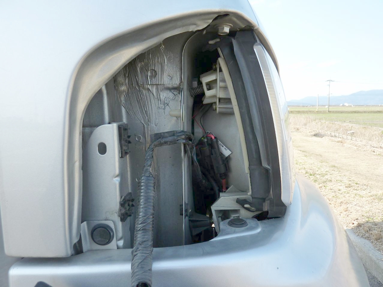①左右のウインカーレンズ(フロントコンビランプ)を外す。(外し方はドアを開けプラスドライバーでフロントコンビランプを固定している2本のネジを裏から外す。そしてフロントコンビランプ本体を車両前方に軽くたたいて取り外す。)