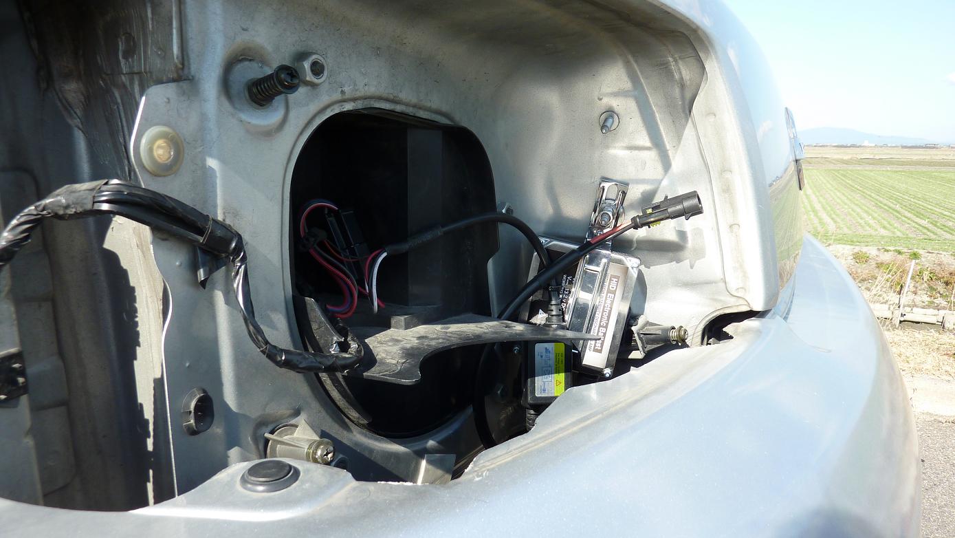ヘッドライトを外した状態の、運転席側のバラスト取付位置。