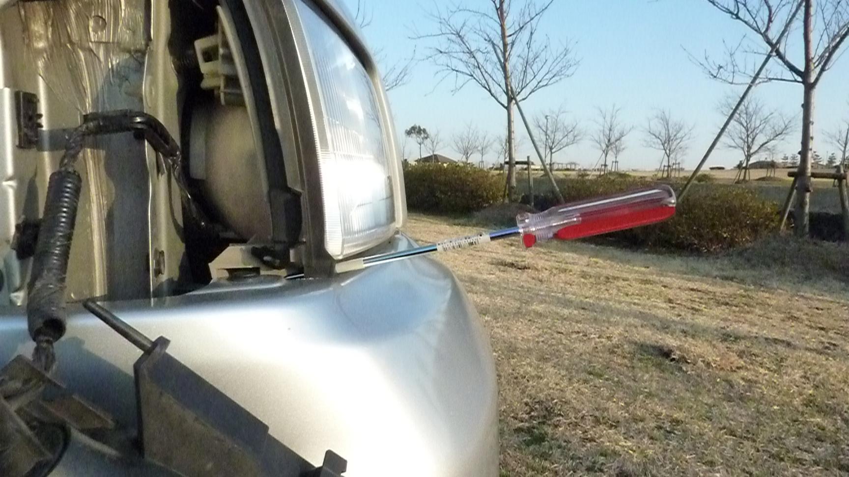 ちなみにバネットバンの光軸調整はプラスドライバーの長いやつをこの角度で差し込む。締めると下がり緩めると上がる。ウインカーレンズは外さなくても調整できるが、慣れるまではネジの頭になかなか合わないと思うので、外したほうが結局早いかも。