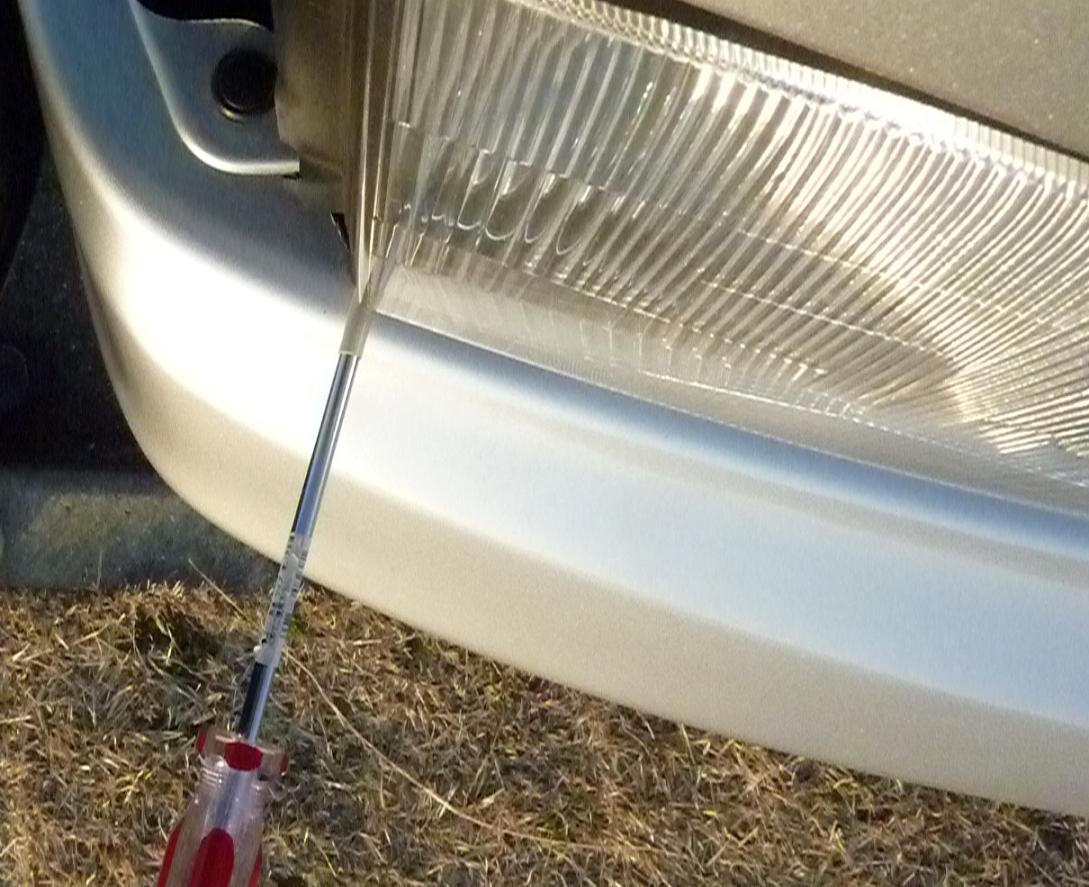 (バンパーは外さなくてもいい) が、これがなかなか外れない。上1本下2本のネジがあるのだが、上のネジは固定されているのでスライドしやすいが、下2本が調整用も兼ねているからなのか、きちっと固定されていないのでスライドしてもネジごと動いてしまいなかなか外れない。外し方にコツがあるのかよくわからないが、とにかく、外れない。なので力任せに外そうとすると、ライト側についているネジの受け用のプラスチックのホルダーが斜めにこじって、割れそうになるので注意。