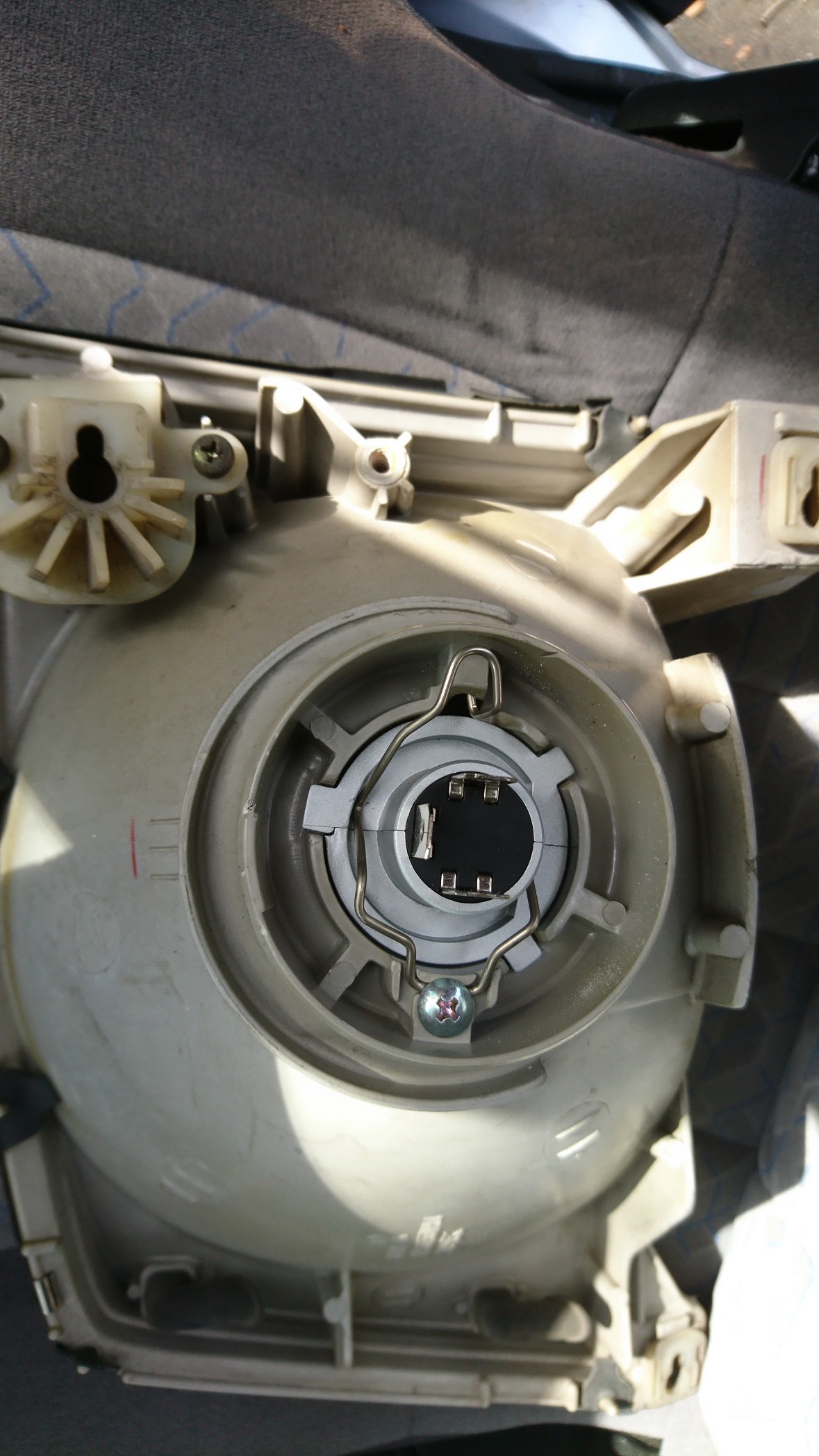 右のヘッドライトを外してバルブのファン部分を左右に動かしてみたが、若干遊びがあるようだ。ライトの防水ゴムのバルブ抑えの部分をニッパで2ミリほど、ぐるりと切断。