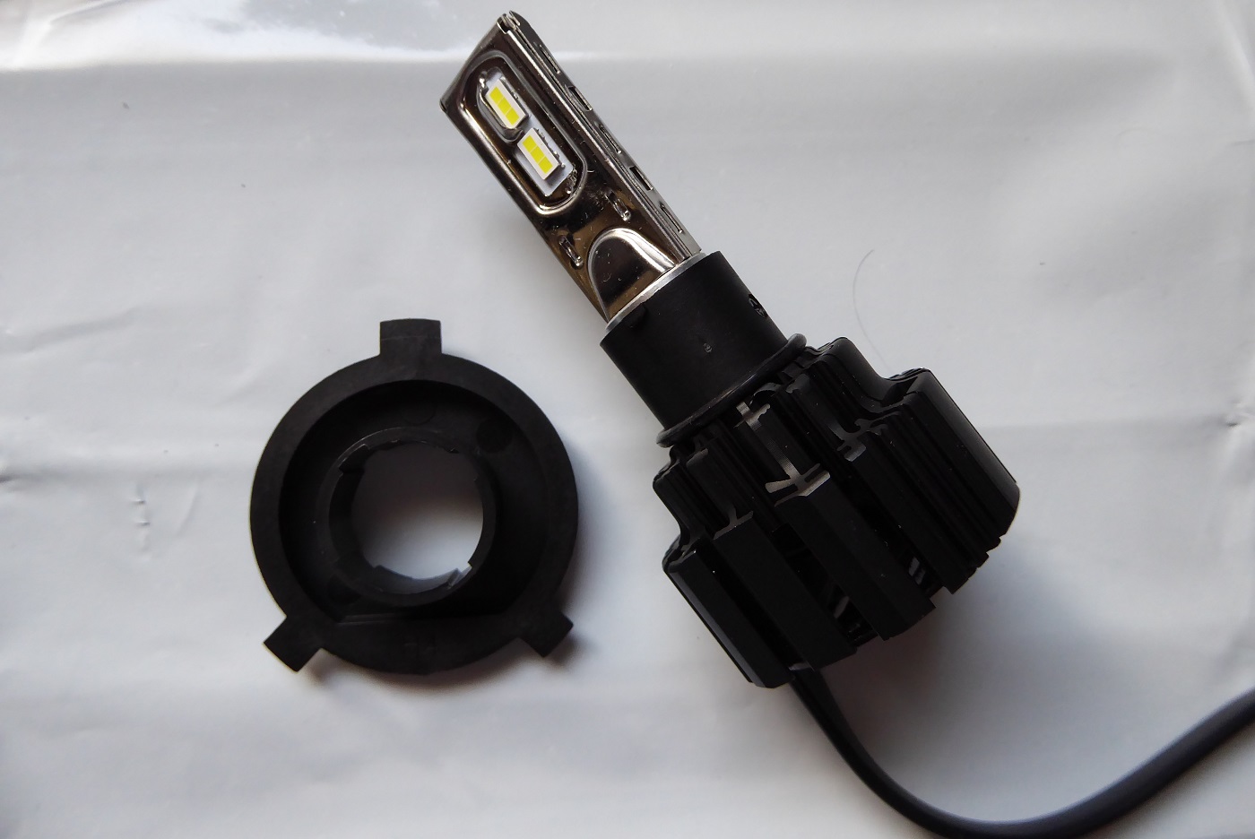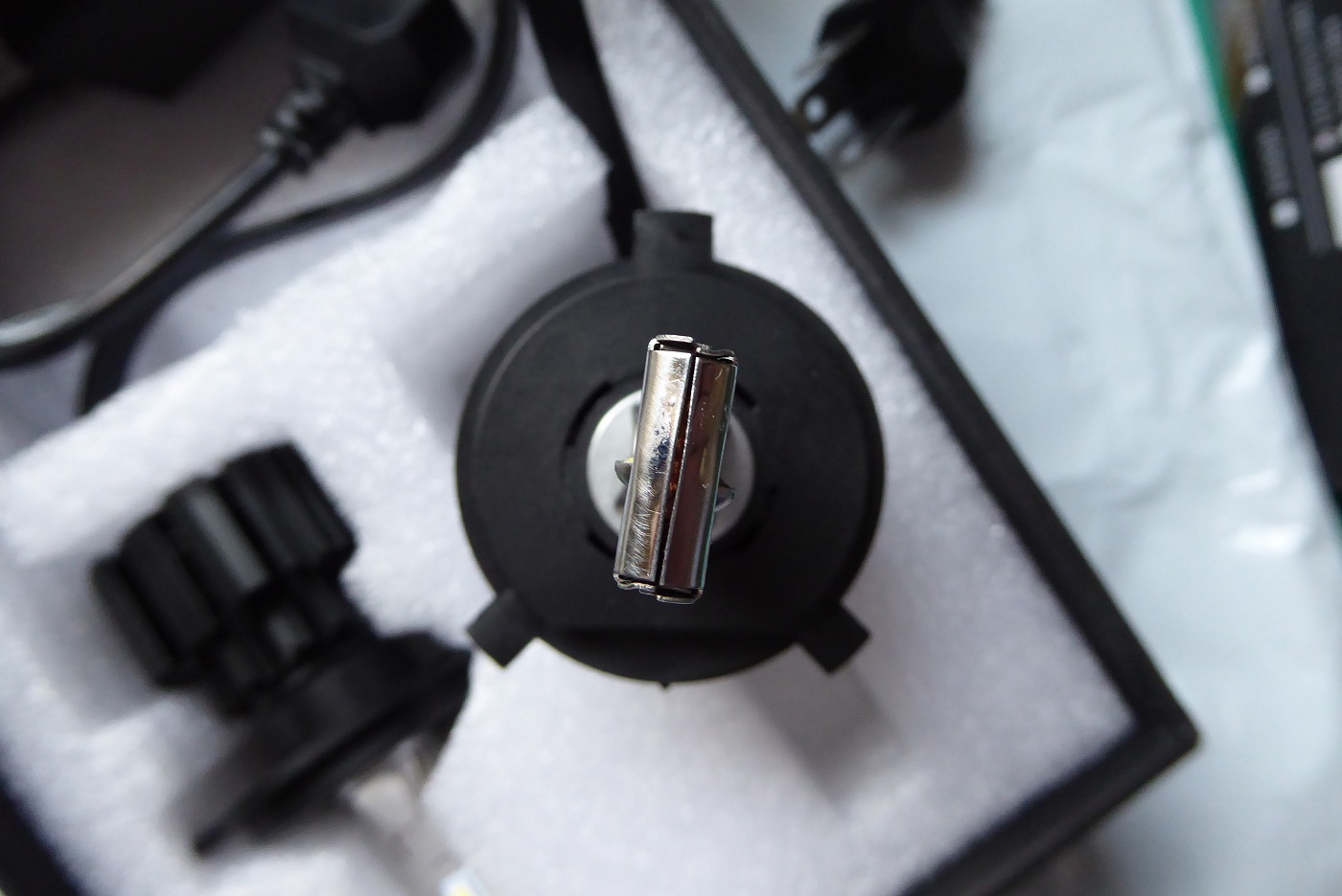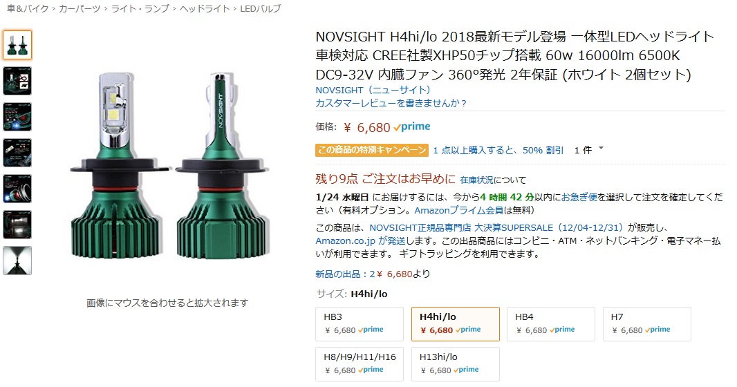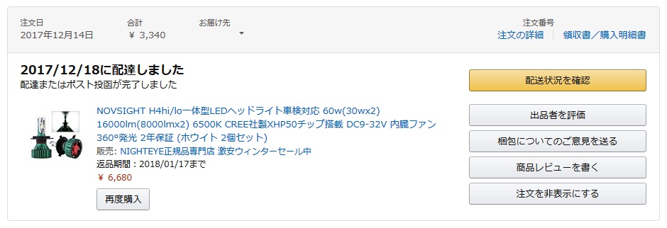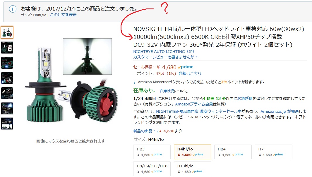 今付けているLED H4ファン付きの配光が気に入らない最中、ほしいものリストに入れていたXHP50チップLED H4ファン付きが半額になっていたので、今度こそはと購入。3,340円だった。
